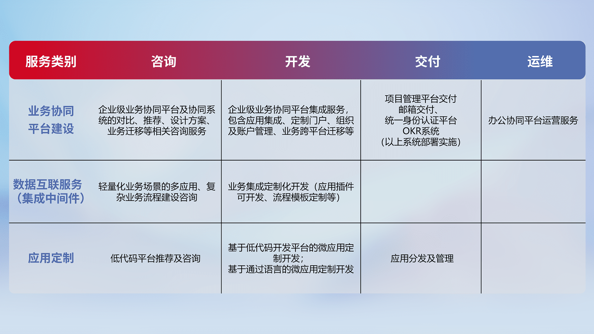 针对钉钉、、企微、、、IDaas等平台级产品提供产品的规划、、、、方案、、交付、、定制化开发等服务,,实现如统一协同办公、、、智能客户服务、、、混合会议管理、、、、智能数据查询、、等业务场景,,实现数字化转型。。。